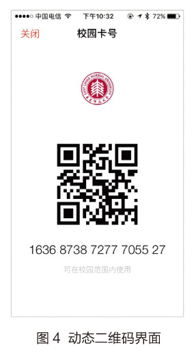 为保证电子校园卡的身份认证安全,防止卡片被盗用,则必须采用安全性更高的方案,即动态二维码。在微信校园卡中,这一动态二维码体系是以原生方式在微信APP中实现的,其服务的稳定性和前后台运行环境的安全性均得到了强有力的保障,学校在这方面并不需要投入额外的精力。用户在微信中打开校园卡详情时,触发动态二维码的更新,其生成过程如图3所示。