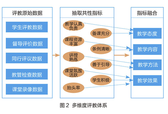 平台建立了分类多维度评教体系。解决多源指标融合问题,对不同维度原始数据进行共性指标抽取与整合,实现数据规范化,并将多维评教指标进行融合计算(如图2所示)。