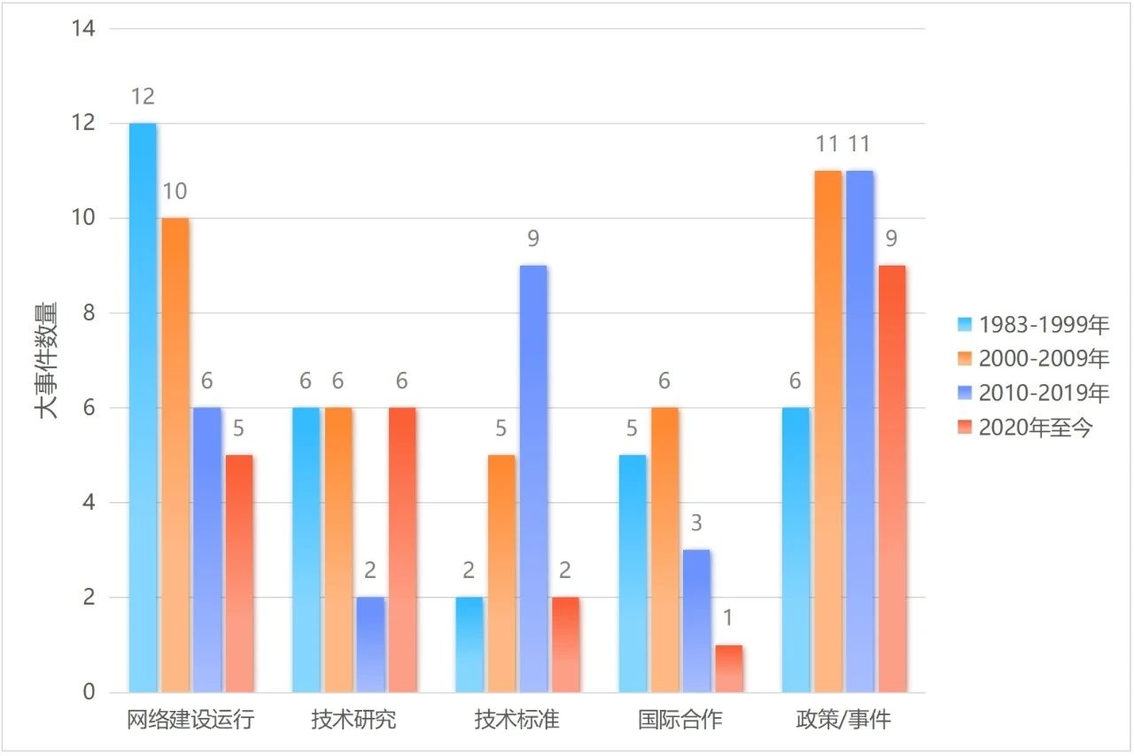 从各大类别来看,网络建设和运行33项、技术研究20项、技术标准18项、国际合作15项、政策/标志性事件37项。