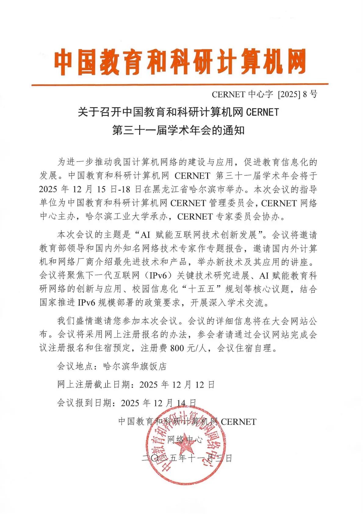 据悉,中国教育和科研计算机网 CERNET第三十一届学术年会将于2025年12月15日-18日在黑龙江省哈尔滨市举办。