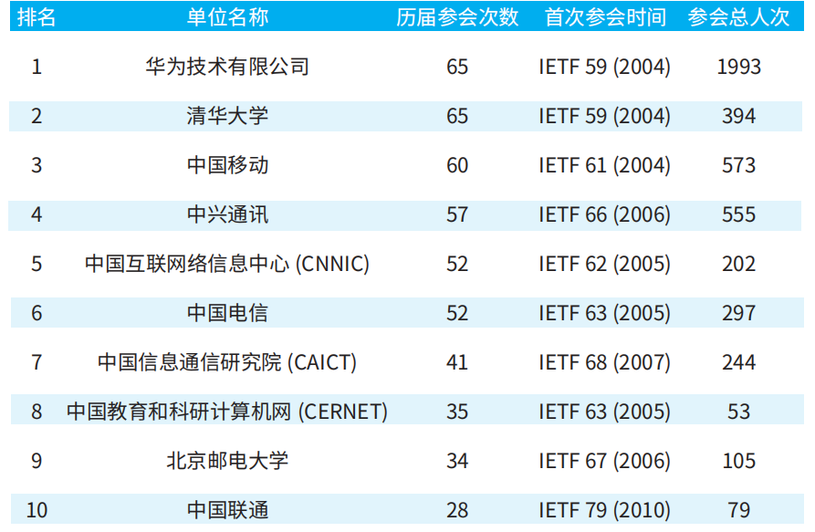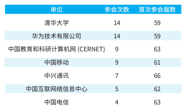 表2 中国大陆IETF参会单位Top 10统计(第59-124届)
