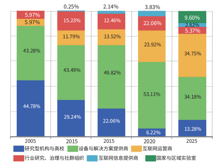 将参与者按机构类型拆解,同样可以观察到一条鲜明的演化路径。如图2所示,在2005年,研究型高校和设备与解决方案提供商是绝对主力,两者贡献了早期近90%的参与力量。随着时间推移,尤其在2010年IETF北京会议前后,互联网运营商的参与度快速提升,在2015年后逐渐与设备商并驾齐驱。这一转变深刻反映了中国作为全球最大网络部署市场的内在逻辑:设备商需要将技术方案推向标准,而互联网运营商则需要将标准落地为可运营、可管理的网络。研究型机构与高校的占比则从主导地位逐渐回落,但持续稳定的参与(如清华、北邮)表明,其始终是顶尖标准人才的摇篮,为整个体系提供长期智力支撑。
