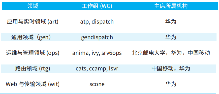 注:本表仅呈现了现阶段(2026年初)的分布。实际上,中国专家担任工作组主席的历史更早,例如在已结束的IPv6过渡工作组(softwire)中,清华大学崔勇教授已于2011年担任主席。