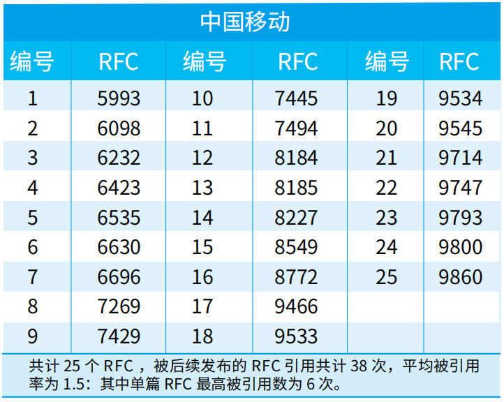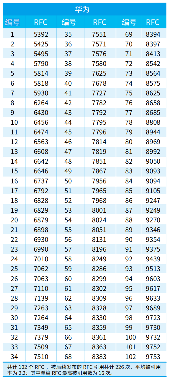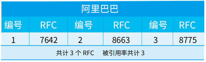 IETF负责制定互联网标准RFC。当前,全球一共有九千多个RFC,其中,第一作者来自中国大陆的有209个(其中有3个未显示第一作者单位)。根据RFC INDEX网站提供的资料,我们整理了由中国大陆作者牵头发布的所有RFC信息,按照第一作者所在单位进行分类,并统计了该单位RFC的总引用率(仅统计被其他RFC引用次数,被草案引用不纳入统计)。