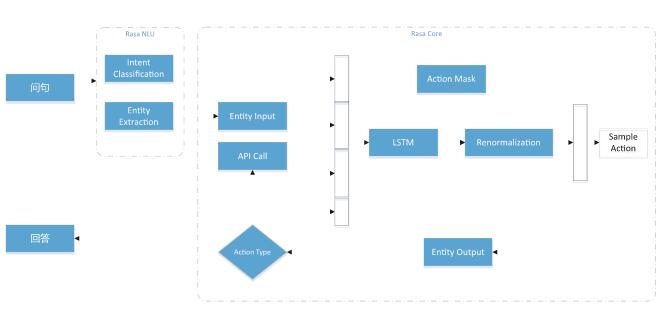 首先,问句通过Rasa NLU将抽取的实体和意图特征转化为高维向量,然后作为输入通过已训练的LSTM循环神经网络模型生成匹配概率向量,最后依据匹配概率做出相应的回答。图2中的Action Type 用于判定问题是直接给出答案,还是需要调用第三方业务接口进行多轮会话。