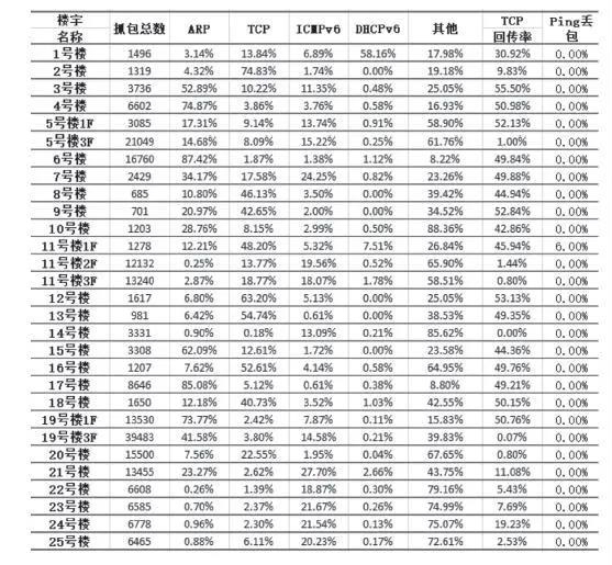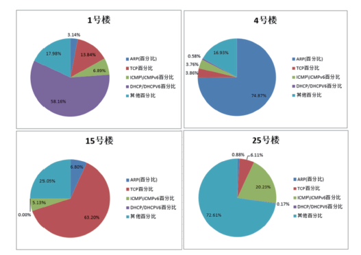 根据表1中的ARP占比统计,发现在4号楼、6号楼、15号楼等二级楼宇中出现大量ARP广播包,在1分钟的总流量包中占比均超过了70%。