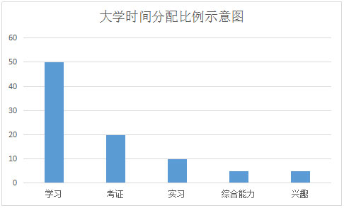 从上图可以看出,大学可利用时间内,至少要花费一半的时间用来学自己本专业的知识,然后20%的时间用来考证,10%的时间用于实习,剩下10%的时间用于自己的兴趣爱好和提升综合能力。