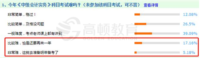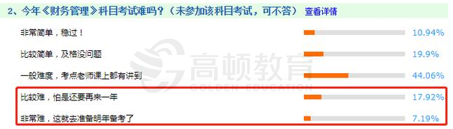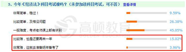 也就是说,调研结果告诉我们:财管难度第1,中级会计实务难度次之,经济法难度最能令人接受,排行第3名。