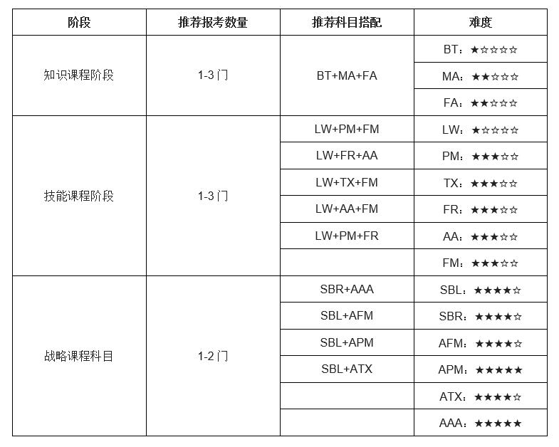 专业阶段包括4门核心科目和2个选修模块,考试难度相对较高,需要考生投入更多的时间和精力进行学习和备考。因此,科目的搭配也需要更加合理和科学。
