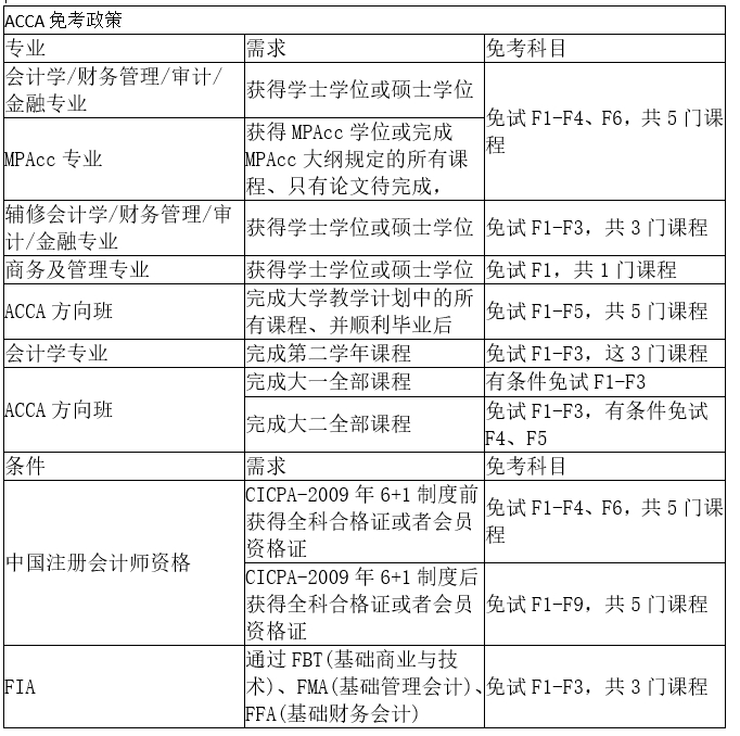 不同学历和身份的免试政策不同,例如教育部认可拥有学士或硕士学位的会计学专业的高校毕业生可以申请免试5门,会计学辅修专业的可申请免试3门,若是法律专业和商务及管理专业,则只能申请1门免试。ACCA免考政策一览: