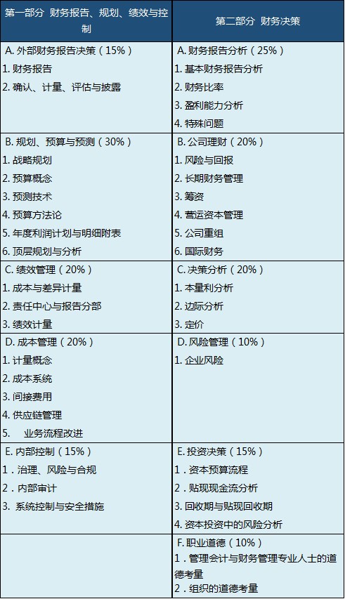 其实cma考试科目很简单,只需要考两门课程,P1-财务报告、规划、绩效与控制和P2-财务决策,详细内容如下图: