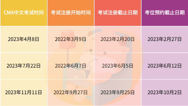 2023年11月的cma考试注册于2022年9月27日开始,缴费截止日期为2023年9月25日,考位预约截止日期定在2023年10月2日,为了保证考生的顺利参加,考生需按规定时间注册报名,完成考位预约,方可参加cma考试。