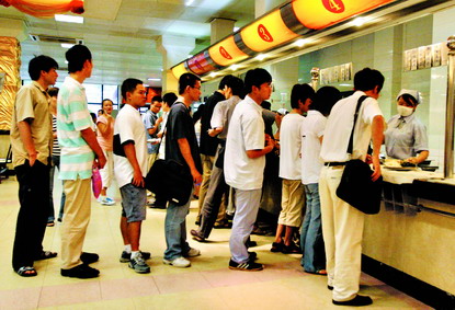 资料图片:在某高校食堂的排队队伍里,赫然看见不少背着公文包的上班族。