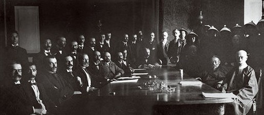 1901年9月7日,中国政府全权代表奕劻、李鸿章与英、俄、美、德、日、法、奥、意、西、荷、比11国代表在北京签订《辛丑条约》。奕劻(右坐一)、李鸿章(右坐二)与11国驻华公使签约。条约规定中国赔款4.5亿两白银,交出税务、使馆区管理权,禁止中国人成立或加入反帝组织。