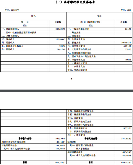 山东大学在信息公开专栏页面上公布的《山东大学2015年部门决算》文档显示,山东大学2015年收支决算总额为68亿元。