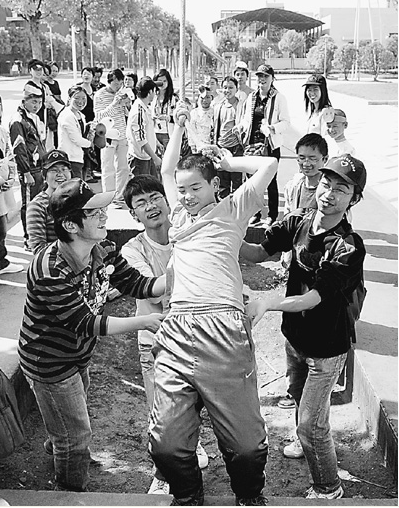 去年4月9日,湖北省武汉市流浪未成年人救助保护中心的10名流浪儿童,在湖北经济学院社会工作专业学生和志愿者同学的带领下,体验运动休闲游戏。 杨宏斌摄(资料图片)