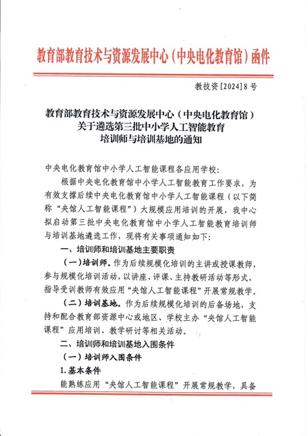 为有效支撑中央电化教育馆中小学人工智能课程(以下简称“央馆人工智能课程”)大规模应用培训的开展,2024年2月22日,教育部教育技术与资源发展中心(中央电化教育馆)正式印发通知,启动第三批中央电化教育馆中小学人工智能教育培训师与培训基地遴选工作。