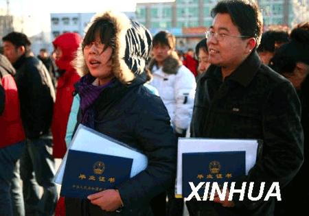 2009年2月16日,参加招聘会的两名毕业生拿着毕业证书排队入场。当日,北京市怀柔区举办“首都人才市场促进高校毕业生就业服务月怀柔区现场招聘会”,为毕业生们提供千余就业岗位。新华社发(卜向东 摄)