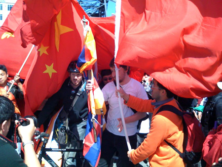 一旦有“藏独”分子出现,立刻被华人和留学生手持五星红旗包围,使其无法靠近火炬手。