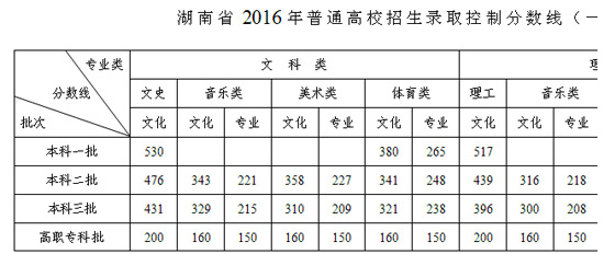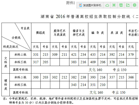 (二)关于本科提前批省外艺术类专业以及湖南大学、中南大学音乐类专业的录取控制分数线。本科提前批中,按独立设置艺术院校招生政策招生的艺术类专业的专业及文化录取控制分数线均由招生院校依据教育部和我省有关规定自主划定;其他省外院校艺术类专业以及湖南大学、中南大学的音乐类专业的专业及文化录取控制分数线由招生院校依据有关规定确定,但文化录取控制分数线不得低于二本文史、理工录取控制分数线的65%,即文科类不得低于309分、理科类不得低于285分。