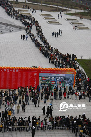资料图片:数万名应聘者排成长龙 来源:浙江在线 林世杰/摄