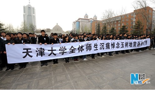 4月21日,天津大学师生在哀悼仪式上为地震遇难同胞默哀。当日早晨7时,天津大学全体师生在校园举行降半旗仪式,深切哀悼青海玉树地震遇难同胞。 新华社记者刘海峰摄