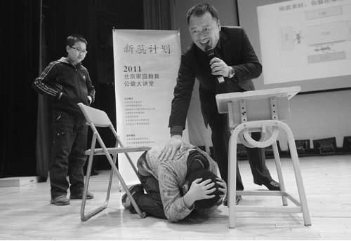 10年前夏令营的一次逃生课,让今年21岁的山东青年方正在日本大地震中成功避险,而教授逃生课的老师吴军生也成了大红人,飞来飞去地给企业、公务员和学生教授避险生存知识。昨天,在市妇联的邀请下,吴军生为史家学校的100多名孩子和家长上了一堂逃生课(如图)。